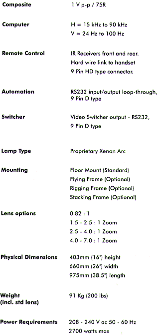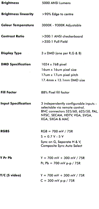 Digital Projection's POWER 5gv delivers brightness in excess of 5000 ANSI lumens. Three configurable inputs accept all major source formats from composite video through XGA. Every source is expertly reformatted by Digital Projection's exclusive Resizing Engine and displayed at a native resolution of up to 1024 by 768 pixels.
