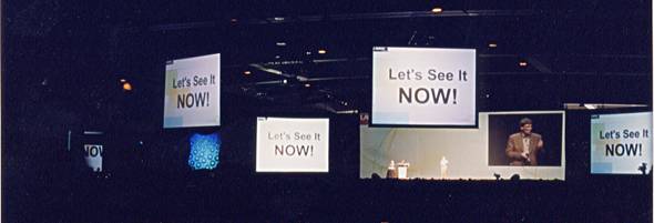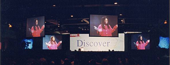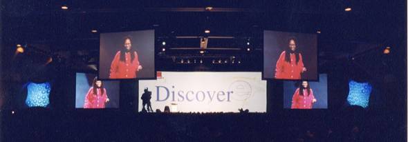 Whenever you put 5000 people in a room, you'd better have big screens for them to look at. The Lawson Software event incorporated a 20' x 60' screen for the stage backdrop with abundant large screens for I-Mag and Speech Support.