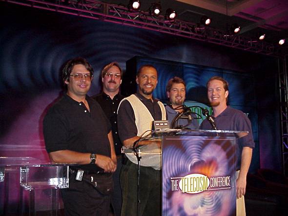 This year saw Jeff Dooley at the Helm of the Echolab switching system (an upgrade from the GVG110). He called shots from 2 - Sony D30 cameras, up to 8 - computers, and Beta and SVHS playback decks as well as elmo slide to video and overhead presenters. Due to the nature of the show he had to simultaneously manage the routing to 2- Power 5 GV video projectors (an Upgrade from the Barco 8100.) 3-27" monitors, 2 - Director monitors as well as a program switched to record. Aaron Hubbard managed CCU's and the video playback and record decks as well as the routing to a 90" x 120" Video wall that lived on stage (supplied by Gearhouse). We also had to provide video and audio feeds to Broadcast.com who did a live broadcast both from the Forbes web site as well as their Broadcast.com site.