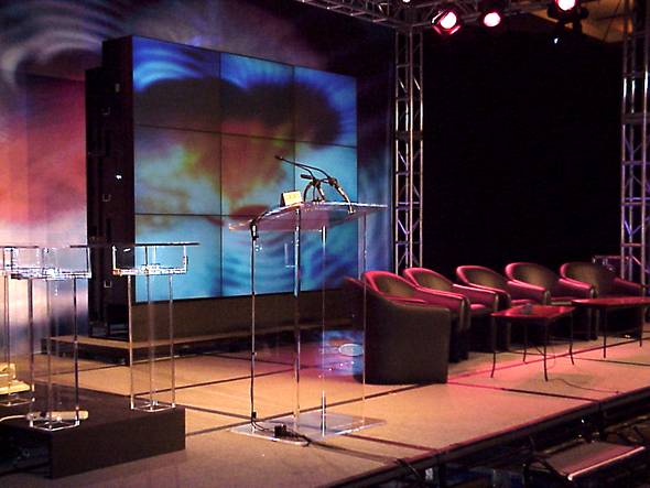 As our staging element was fairly limited (a video wall, 5 black chairs and Plexiglas Podium and Table) the lighting and the Backdrop really became the focus of the room. As The LD Iain Bible convinced me that this show needed 4 - Martin MAC500 moving head units adding a very nice texture to the overall high tech look of the theme.